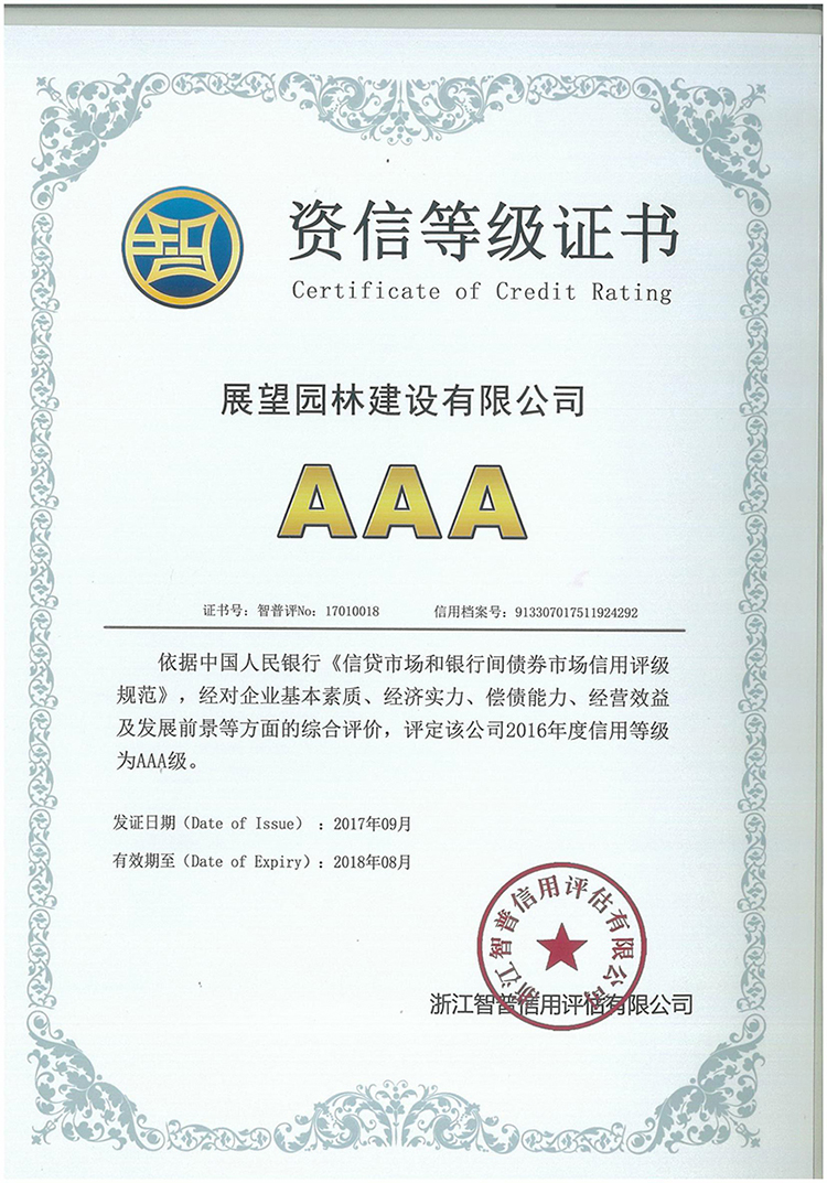 授予展望园林建设有限公司“AAA”级信用单位
